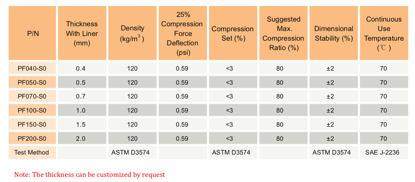 TM PF-S0 系列是一種超柔軟、低密度、緩慢回彈的泡棉,用于電子設備中的緩沖、保護性密封和長期間隙填充。可以達到80%的壓縮比。S0系列泡棉具有非常低的壓縮永久變形率,還擁有高密封性能,以及在不平整表面上也有出色的沖擊吸收能力。" />