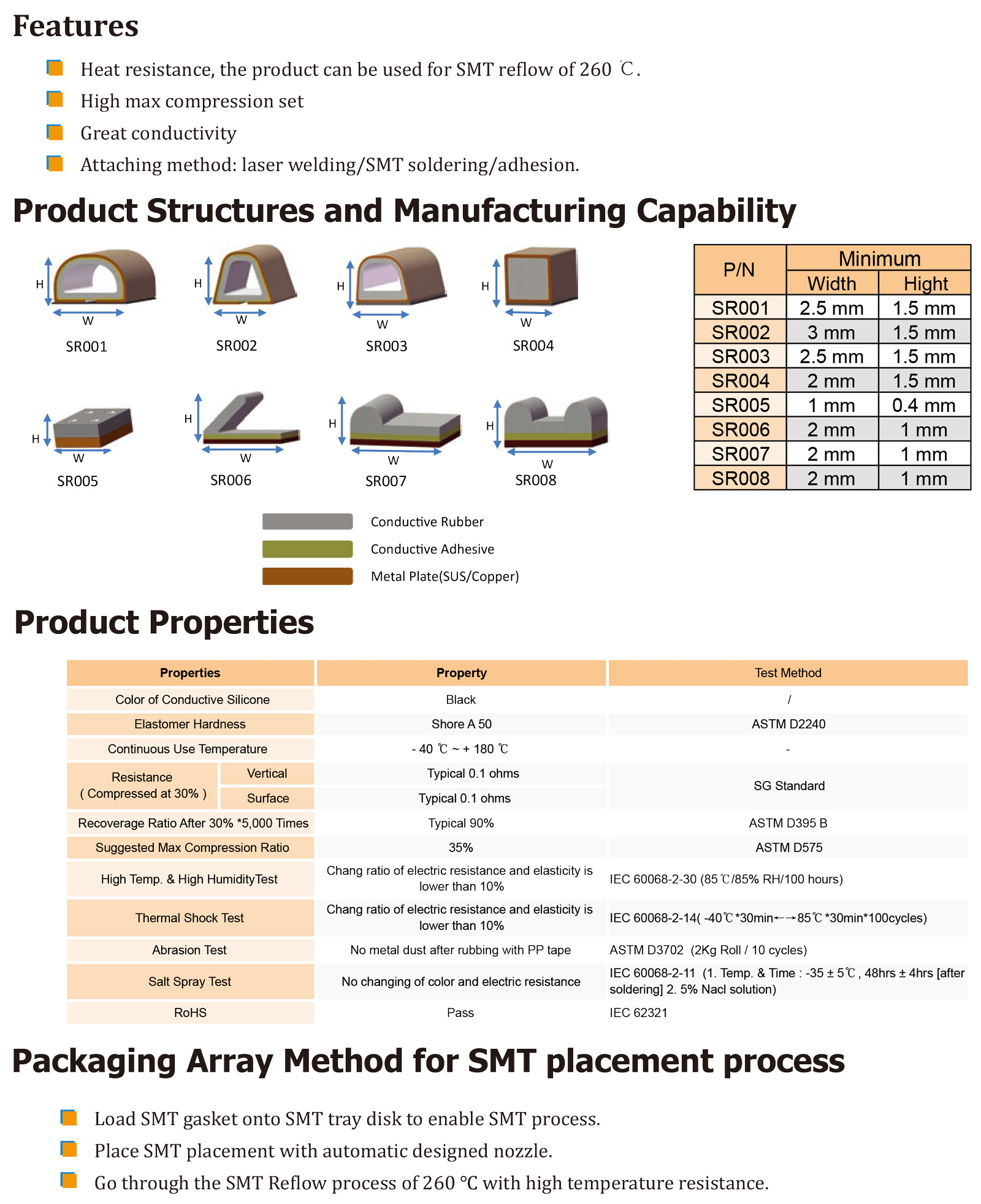 TM SR 系列 SMT橡膠墊圈呈矩形,寬度較窄,設(shè)計(jì)用于接地 用于PCB和FPCB的焊盤或連接器,可以大大降低電子產(chǎn)品的EMI/RF噪聲。它是一種可回流焊接的彈性導(dǎo)電介質(zhì),可通過(guò)SMT安裝在PCB和FPCB上。" />