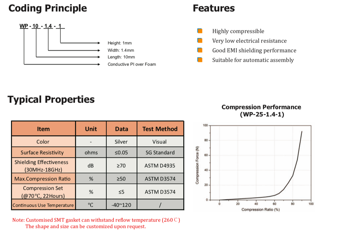 TM WP系列導(dǎo)電PI覆蓋泡棉材料由高導(dǎo)電性的Cu/Ni鍍層PI、PU泡棉組成 芯和導(dǎo)電壓敏丙烯酸粘合劑。這些高度可壓縮的材料 設(shè)計(jì)用于提供卓越的EMI屏蔽和接地性能,并且防塵和 防潮。WP系列產(chǎn)品很容易縮小尺寸,特別適用于計(jì)算機(jī)內(nèi)的固定墊圈應(yīng)用, 智能手機(jī)、液晶顯示器/電視和電信制造業(yè)。 可根據(jù)要求定制回流焊墊片。" />
